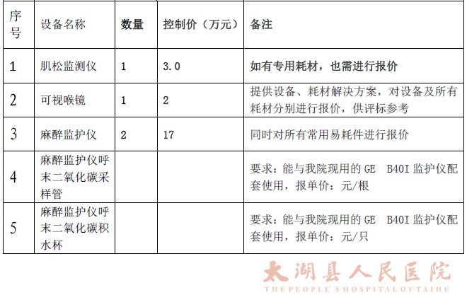 太湖县人民医院拟以询价的方式对麻醉恢复室、耗材设备进行采购,现将有关事项说明如下: