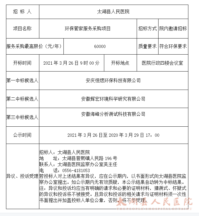 太湖县人民医院环保管家服务采购项目中标候选人公示