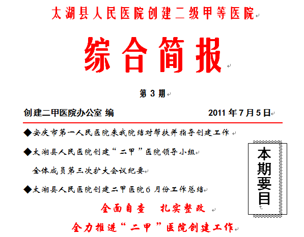 [align=center][size=5][b]安庆市一院来我院结对帮扶并指导“二甲”创建工作[/b][/size][/align][align=left][size=4] [/size][/align][size=4][/size][align=left][size=4] 6月22日上午,安庆市第一人民医院对口帮扶太湖县医院启动仪式在县医院会议厅举行,县委常委、县纪委书记杨美华出席仪式并讲话,县卫生局长王锋参加仪式。仪式由县医院党总支书记方书法主持,院长刘小平致欢迎辞,安庆市第一人民医院党委书记、院长储艳云,副院长高金华亲率市一院医务科、发展办、门诊部、创建办等职能科室负责人及专家组一行12余人参加了仪式。启动仪式结束后,安庆市第一人民医院领导与太湖县医院领导就对口帮扶工作和“二甲”创建工作进行了深入交流座谈,专家组成员深入到骨科、内科、外科、急诊科等科室进行了教学查房,并就创建“二甲”医院工作进行了指导。[/size][/align][size=4][/size][align=left][size=4] 县委常委、县纪委书记杨美华首先代表县委县政府,对安庆市第一人民医院领导和专家一行的到来表示热烈的欢迎和衷心的感谢,并就太湖县基本县情作了简要介绍。杨书记要求:县医院要高度珍惜安庆市第一人民医院提供的这次帮扶机会,做好与安庆市第一人民医院帮扶对接,通过专家传帮带,迅速提高专业技术水平。县医院争创“二甲”,是县医院自身发展的需求,也是县卫生事业发展的必然要求,希望县医院以此次活动为契机,抓住机遇,认真学习安庆市第一人民在医院管理、医疗技术和服务等方面的先进经验,不断提升医院综合实力,努力争创二级甲等综合性医院,力争把太湖县人民医院打造成皖西南地区一流的县级医院。[/size][/align][size=4][/size][align=left][size=4] [/size][/align][size=4][/size][align=left][size=4] 县医院院长刘小平在致辞中说:首先感谢安庆市第一人民医院领导班子在县医院创建“二甲”工作进入全面自查整改的关键时刻,亲临指导创建工作。县医院将进一步密切与安庆市第一人民医院的关系,主动加强业务上的联系,虚心接受专家指导,努力拓展更多、更广阔的协作空间,努力使太湖县人民医院的医疗服务水平迈上一个新的台阶。安庆市第一人民医院院长储艳云表示:太湖县人民医院与安庆市第一人民医院有着良好的合作基础,市一院不仅会在太湖县医院创建“二甲”医院工作上给予全力的支持,今后还将在医院管理、医疗、护理、科研等方面继续给予长期、全面的指导和帮扶。[/size][/align][size=4][/size][align=left][size=4] 安庆市第一人民医院作为安庆地区最大的三级综合性医院之一,2010年顺利通过三级医院评审,在医院管理、医疗技术和服务等方面具有先进的经验。此次安庆市第一人民医院与太湖县人民医院的结对帮扶,必将全面提升太湖县人民医院的医疗技术和服务水平,加快推进太湖县卫生事业顺利发展。[/size][/align][size=4][/size][align=left][size=4] 22日下午,安庆市一院创建“三甲办”副主任孙荣亮、急诊科主任许海还分别作了《创建等级医院过程及要点》、《 急诊创面的处理 》专题讲座。[/size][/align][size=4][/size][align=left][size=4] [/size][/align][size=4][/size][align=left][size=4] [b]后记:[/b]两院已制定帮扶专家安排计划,7-9月份安庆市第一人民医院将按计划派遣专家来我院帮扶。[/size][/align][size=4][/size][align=left][size=4][b] (太湖县人民医院创建“二甲”办公室)[/b][/size][/align][size=4][/size][align=center][size=4][b] [/b][/size][/align][size=4][/size][align=center][size=5][b]太湖县人民医院创建二级甲等综合性医院[/b][/size][/align][size=5][color=#ff0000][/color][/size][align=center][size=5][b]领导小组全体成员第三次扩大会议会议纪要[/b][/size][/align][size=4][/size][align=center][size=4][b] [/b][/size][/align][size=4][/size][align=left][size=4] 2011年7月5日下午,创建领导小组全体成员扩大会议在门诊七楼多功能厅召开,会议由创建领导小组组长、党总支书记方书法同志主持,创建领导小组全体成员,各科主任、护士长参加了会议。[/size][/align][size=4][/size][align=left][size=4] 各专业组首先向领导小组汇报了6月份创建工作,创建办公室就6月份工作进行了总结,并就7月份创建工作进行了安排。创建领导小组组长、院长刘小平在听取汇报后指出:当前全院创建工作总体上都在按计划推进,各部门、各科室做了大量工作。通过创建工作,医疗服务质量明显提高,但创建工作时间紧、任务重,目前还存在不少问题,各专业组、各部门、各科室进度不平衡,部分科室未完成6月份工作计划。刘院长强调:院领导班子成员、创建领导小组全体成员及各科主任、护士长要站在全院大局的高度,高度重视创建工作,强化责任意识,把创建工作当作主要工作来抓;各科室要制定切实可行的整改计划,各专业组要尽快制订整改计划表,梳理出本组存在的问题提交创建领导小组研究。最后,创建领导小组组长、党总支书记方书法做了总结发言。方书记强调:7月份检查督促组将开展督查工作,各专业组、各科室要争当创建先锋,不要做被处罚的典型;部分落后的科室要用一周的时间补缺补差,完成6月份未完成的工作。[/size][/align][size=4][/size][align=left][size=4] [/size][/align][size=4][/size][align=left][size=4][b] (太湖县人民医院创建“二甲”办公室)