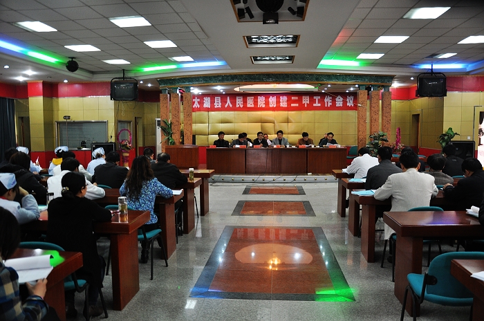 [size=4] 2011年4月7日下午,太湖县人民医院创建二甲医院工作会议隆重召开。会议由院党总支部书记方书法主持,刘小平院长作了题为《全院动员,全力以赴,为实现“二甲医院”创建目标 而努力奋斗》的工作报告。医院领导班子成员、各临床及医技科室正副主任、正副护士长及职能科室全体工作人员参加会议,县卫生局李盛华副局长出席会议并讲 话。[/size]