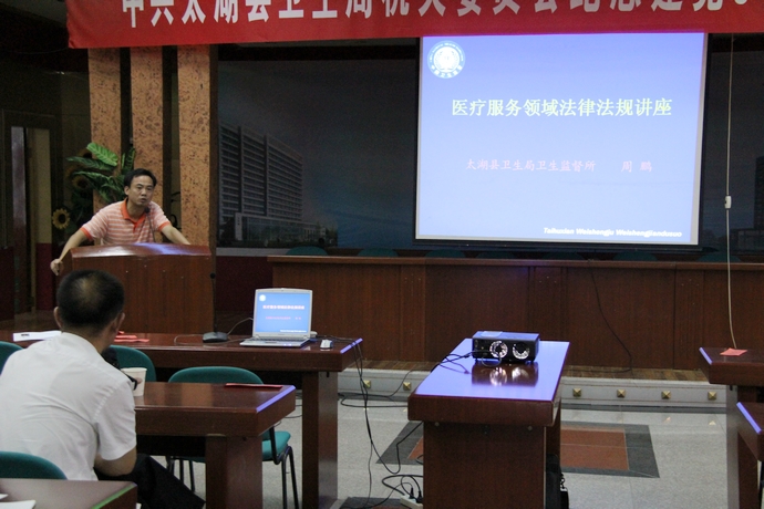 [size=4] 2011年7月7日下午,临床管理组在门诊七楼多功能厅举行全院法律法规培训。此次培训会得到院领导高度重视,会议由郑效珍副院长主持,刘小平院长、邓亚东副院长与会。培训邀请了太湖县卫生局卫生监督所周鹏主任做了《医疗服务领域法律法规讲座》。临床管理组组长、业务副院长郑效珍在发言中强调:创建二甲医院是我院今年的中心工作,全院职工尤其是临床医务人员要增强法律法规意识,维护医患双方合法权益,促进医疗安全,减少医疗隐患,切实做到“依法行医”。