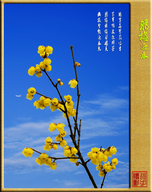 伫立庭院,赏着梅,想着有关梅的诗句与故事,抬望眼,穿过千年时光,遥望到孤山伴梅一生的隐士,想起那个“梅妻鹤子”的故事,也想起很多关于梅的诗篇,想起“梅须逊雪三分白,雪却输梅一段香” “已是悬崖百丈冰,犹有花枝俏”,是那样意味深长。喜欢“零落成泥碾作尘,只有香如故”的洒脱,喜欢“疏影横斜水清浅,暗香浮动月黄昏”的韵味,喜欢 “遥知不是雪 ,唯有暗香来”的清幽,喜欢 “来日倚窗前,寒梅著花未?”的深情,喜欢“寻常一样窗前月,才有梅花便不同”的独特,喜欢“世间何处寻奇葩? 一剪寒梅凌天涯”的荡气,喜欢 “雪满山中高士卧,月明林下美人来”的风韵,喜欢“我念梅花花念我,关情”的柔情,一个和梅有缘的女子,心中的诗歌里,句句是梅的影子。回忆着这些美丽的诗句,闭目凝想着梅的神韵,感受着梅的力量。对,力量,我在想,这小小的六瓣精灵,该是有着怎样的力量,才得以突破严寒,笑傲花枝,我们,也该如梅一样,周遭寒冬也罢,困难也罢,都该用一股力量、一份坚强去面对。