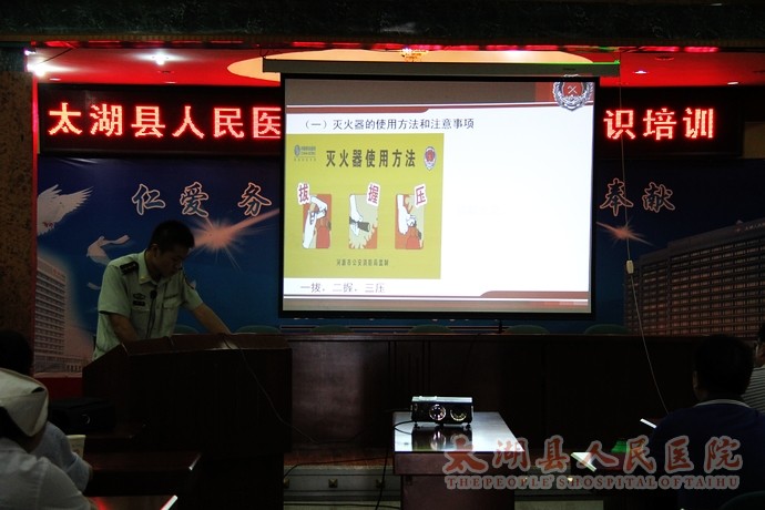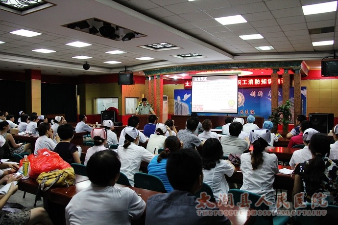 为了使全院上下进一步了解消防基础知识,提高安全防范意识,增强自我保护能力,掌握对突发火灾的应变、逃生技能,学会灭火以及有序地进行人员、财物的疏散处理,确保员工及病员生命财产安全。7月25日下午,我院邀请县消防队专家来院开展消防知识培训讲座暨应急疏散演练,院领导方书法、邓亚东、郑效珍参加讲座和演练活动,全院各级消防安全责任人100余人参加活动。