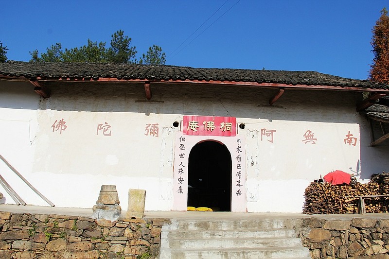 一群人同时从山脚下出发,沿山路上行。转眼,因体力不一,而分成三三两两结伴而行。我们几个先行者,时而沿机耕路快走,时而觅小道,在草丛中串行。虽不曾攀越悬崖I峭壁,可还是个个都汗流浃背,气喘吁吁。于是,到山腰的“桐佛庵”小憩,庵里的主持师傅,烧了热腾腾的开水,招待了我们。