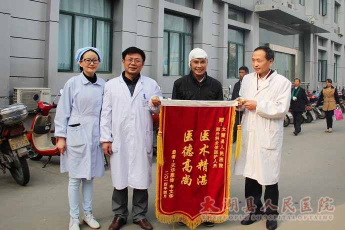 4月4日上午,县医院急诊外科大楼外 传来一阵响亮的鞭炮声,紧接其后的是一位患者家属高举一面锦旗,满怀感激的送给带给他全家人幸福和健康的神经外科医护人员。他摸着自己还缠着纱布的头,笑 着说:“你们医院的医护人员对患者真是照顾得太好了,是你们把我从死神手里拉回来了”。据了解,送锦旗的患者是天华镇李杜村的韦文华,去年他不幸发生车 祸,导致两侧头部颅内广泛出血,病情极为危重,随时可能出现生命危险,神经外科刘棣主任立即召集全科医生为他制定了周密的手术方案,在他头部两侧开了两个 口子,清除了血肿,止住了颅内出血。在医护人员的精心治疗下,韦文华顽强地生存下来了。