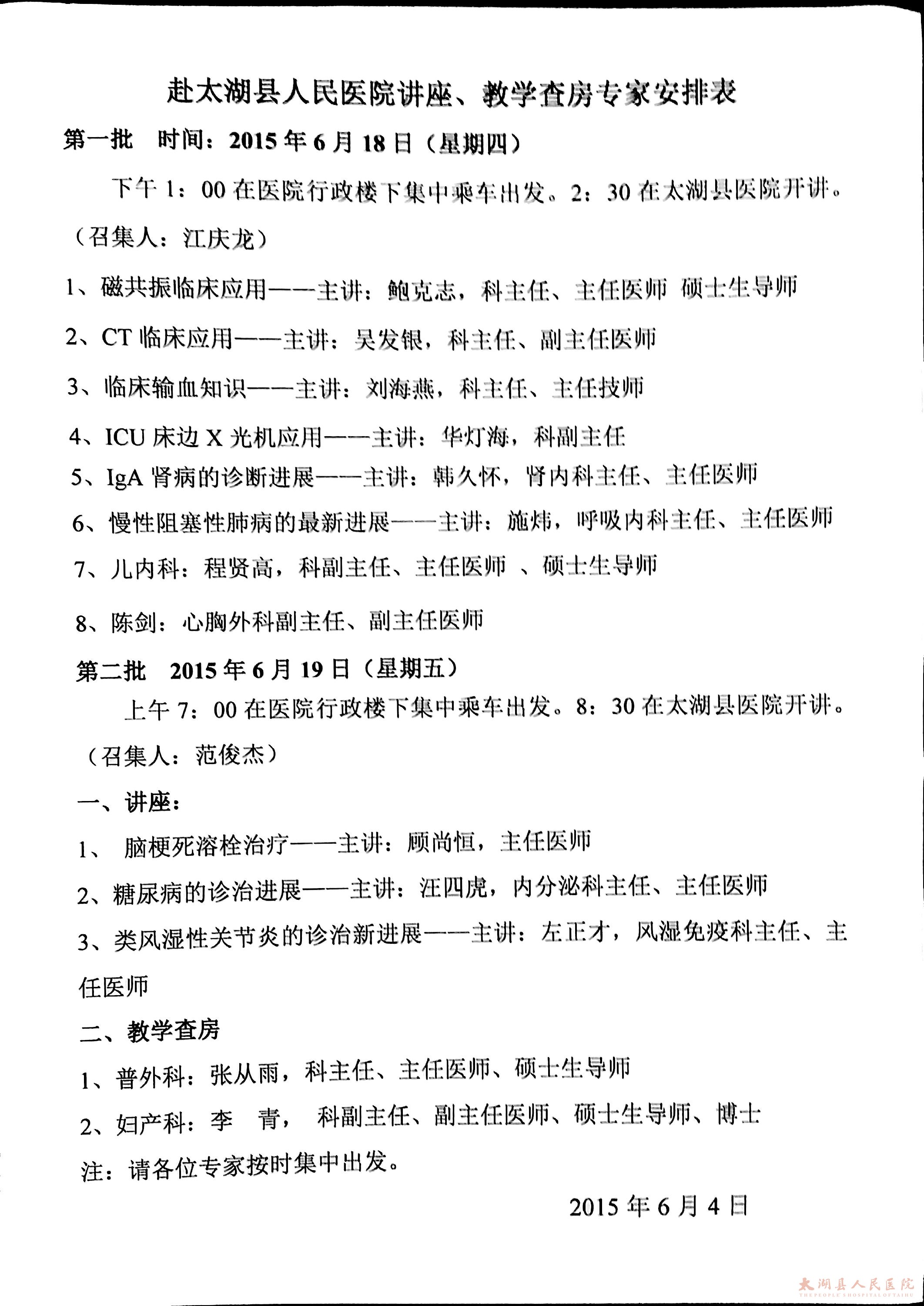 6月18日、19日,安庆市立医院专家将来我院进行讲座及教学查房。专家涉及影像、输血、神经内科、普外科、妇产科、儿内科、肾内科、内分泌科、呼吸内科、风湿免疫等各个专业,请各相关专业医务人员注意查看讲座信息。