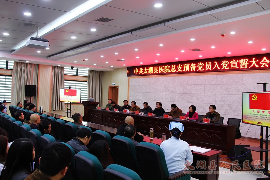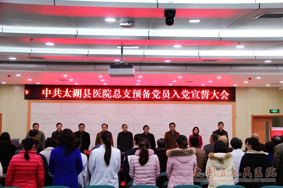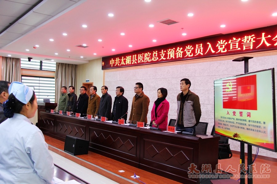 11月19日下, 我院新党员入党宣誓仪式在学术报告厅隆重举行。县卫计委党组副书记王志强、局机关党委组织委员李敬生,医院党总支书记邓亚东出席仪式。仪式由副院长甘志华主持。