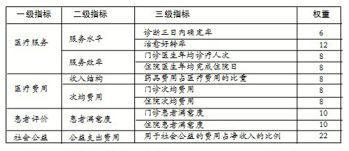 提高医疗服务水平、降低患者医疗费用、承担社会公益责任是医院公益性的最直接体现,这已是社会的普遍共识。当然,反映这三个方面的主观、客观指标很多,遵循科学性、实用性、简洁性、可比性、导向性的原则,笔者确定了以下10个指标: