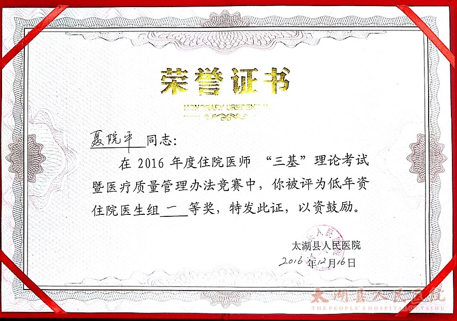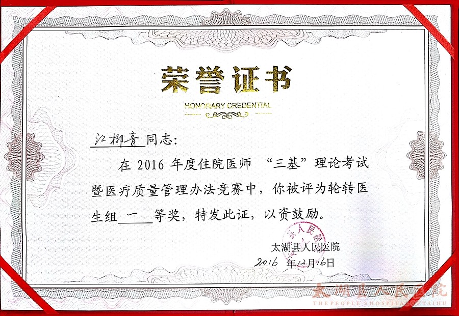 为营造良好学习氛围,提高职工医疗质量管理意识,该院于2016年12月15日举行了住院医师 “三基”理论考试暨医疗质量管理办法竞赛。本次竞赛全院47名年轻住院医生参加,聂院平、江柳青分获低年资住院医生组、轮转医生组一等奖。