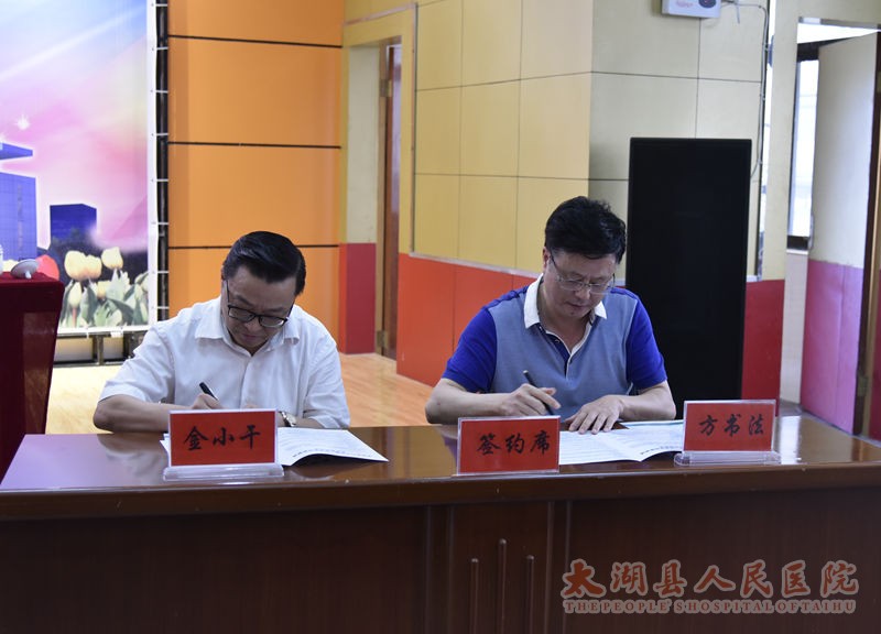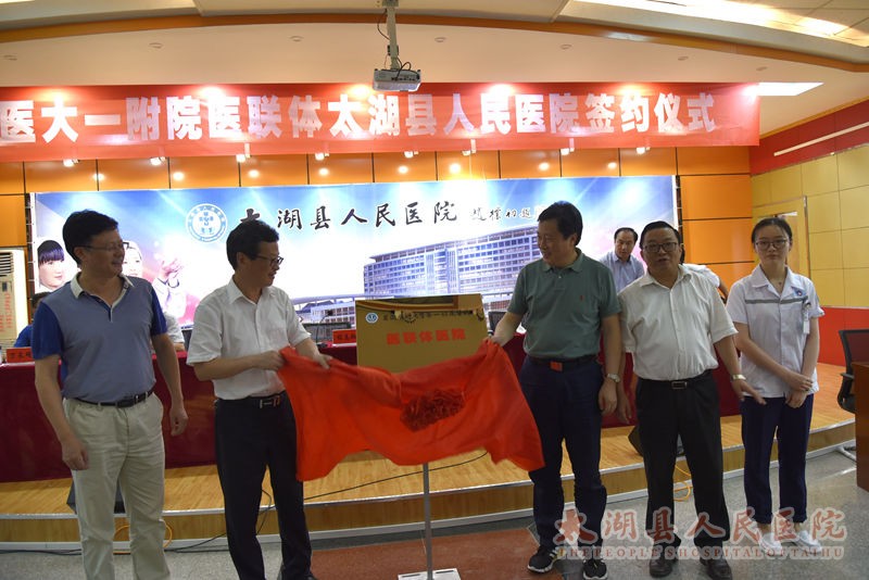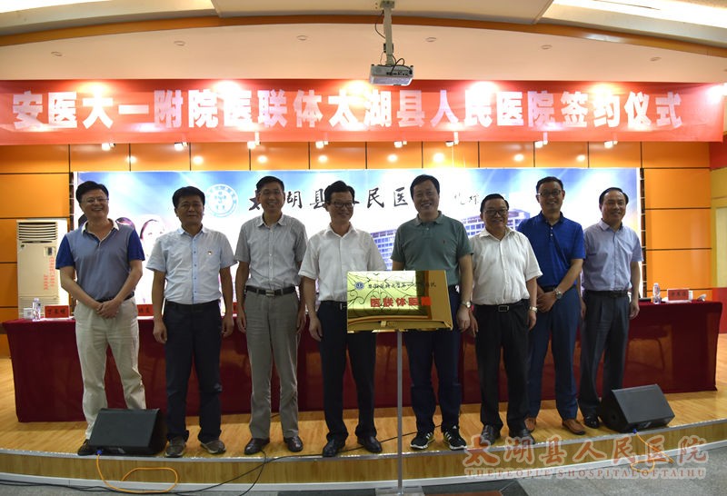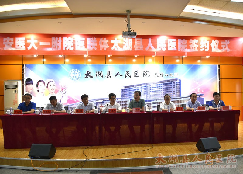 在喜迎中国共产党96周年华诞之际,6月30日,安医大一附院、太湖县人民医院医联体签约仪式在门诊七楼隆重举行。县委书记程志翔、副县长阮波,安医一附院党委书记梁朝朝、副院长金小干等领导出席签约仪式,签约仪式由县卫计委主任王锋主持。医院班子成员、二级机构负责人及各临床医技科室主任、护士长参加。