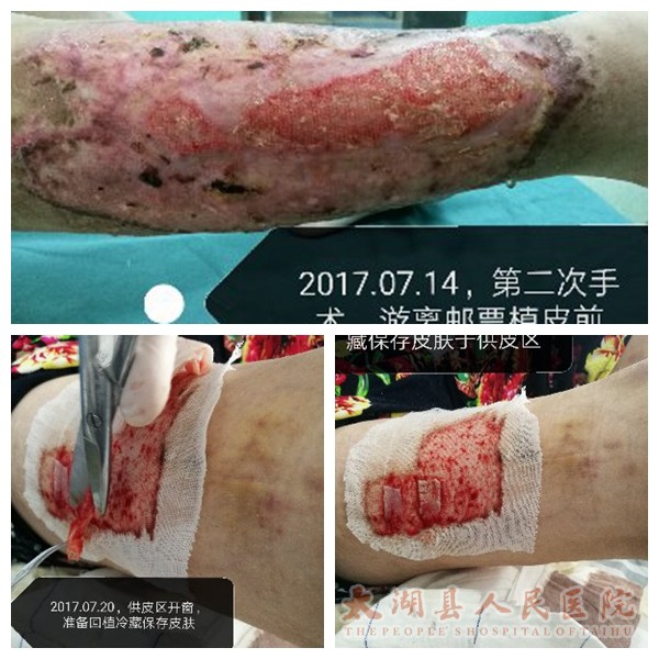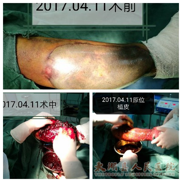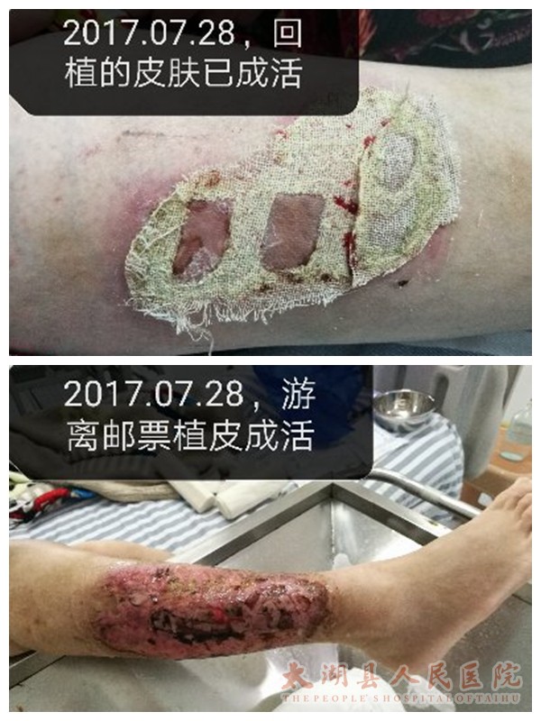 4月11日,患者带着一丝希望来到县医院骨一科,找到医院副院长、骨科主任郑效珍,郑院长仔细查看病情,通过与患者及家属耐心细致的沟通,取得患者及家属的同意后,制订详细手术实施方案,于当日带领床位医生孔尧急诊对患者行“右小腿血肿清除+原位植皮”,术后继续透析,隔天换药,经过3个月不断努力,原位植皮75%成活。考虑患者情况特殊性,相对常人愈合的过于缓慢,郑院长迎难而上,与患者及家属沟通,于2017年7月14日行“右小腿血肿清除术后皮肤缺损创面清创+游离邮票植皮”,并留存部分皮肤于冰箱冷藏备用,然后于7月20日回植于取皮区以保障取皮区创面愈合,这在我院、我县、我市尚属首例!目前患者供皮区,受皮区及后来回植的皮肤均成活良好,成功保住了患肢。(骨一科 孔尧)