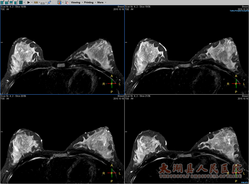 据了解,MRI具有良好的组织分辨率,无辐射,对乳腺疾病诊断具有重要价值。随着MRI软硬件技术的不断发展,脂肪抑制序列和对比增强技术的应用,使MRI诊断乳腺疾病的敏感性和特异性进一步提高。MRI动态增强(DCE1+6期)检查在显示肿瘤的同时还可显示肿瘤的供血血管、肿瘤与胸壁的关系、腋窝淋巴结有无转移等,对乳腺癌术前分期有较高的准确性。MRI成像技术、序列的综合应用能更好地鉴别乳腺良、恶性病灶,并对病变进行全面的评估,为临床提供更多的信息,为其拟定治疗方案提供更大的帮助。