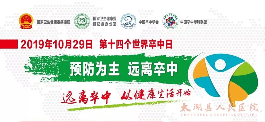 2019年10月29日是第14个“世界卒中日”,宣传主题是“预防为主,远离卒中”,口号为“远离卒中,从健康生活开始”。